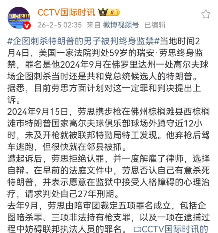 当地时间2月4日,美国一家法院判处59岁的瑞安·劳思终身监禁,罪名是他2024年9月在佛罗里达州一处高尔夫球场企图刺杀当时还是共和党总统候选人的特朗普。